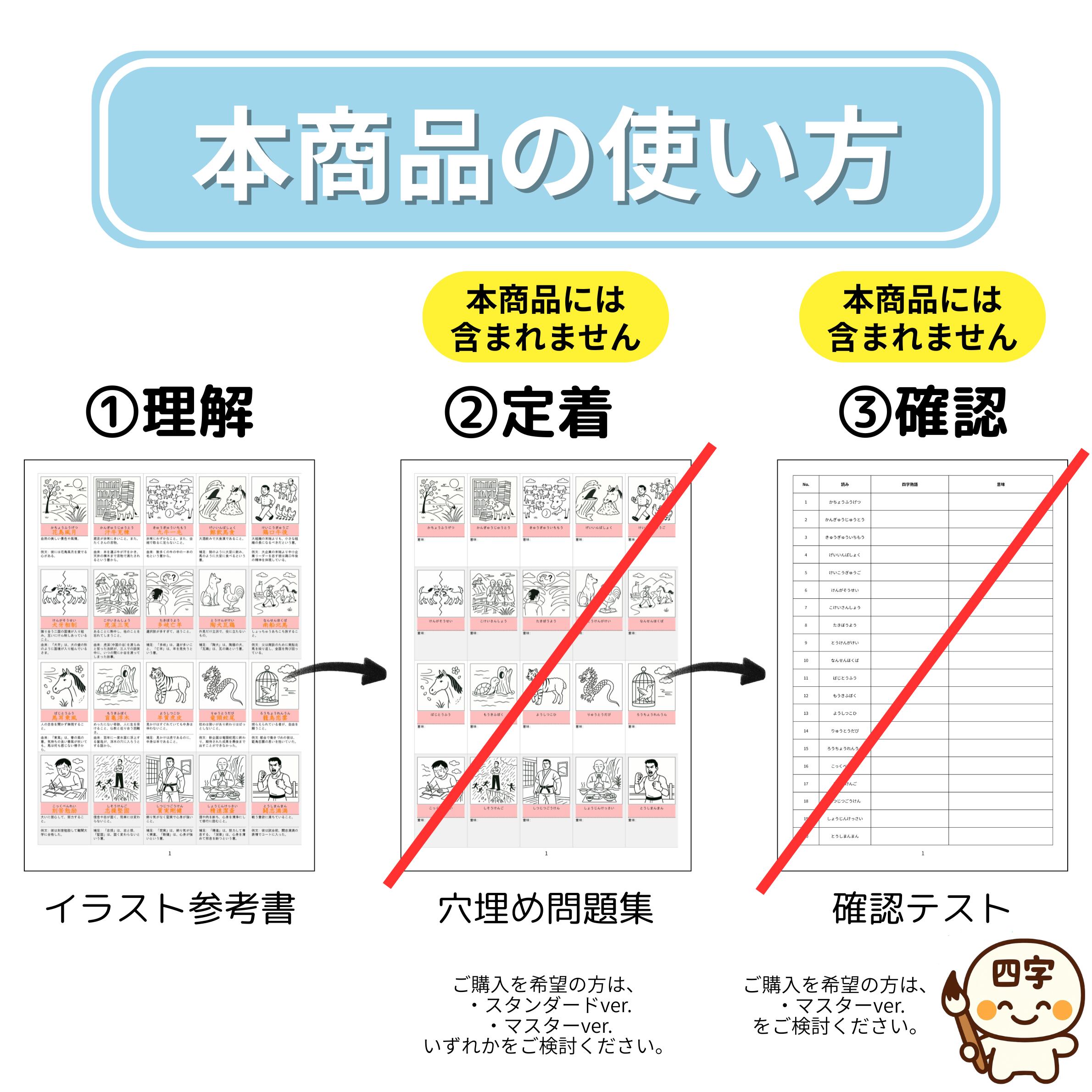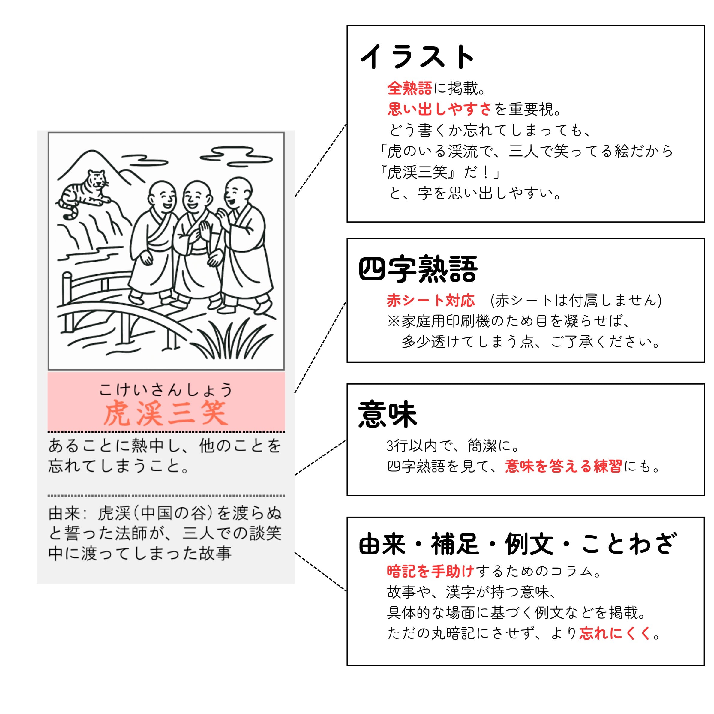 本商品は、従来の参考書になかった「イラスト」を全熟語に添付しております。したがって、四字熟語を、“直感的”“効率的”に理解できる構成になっております。