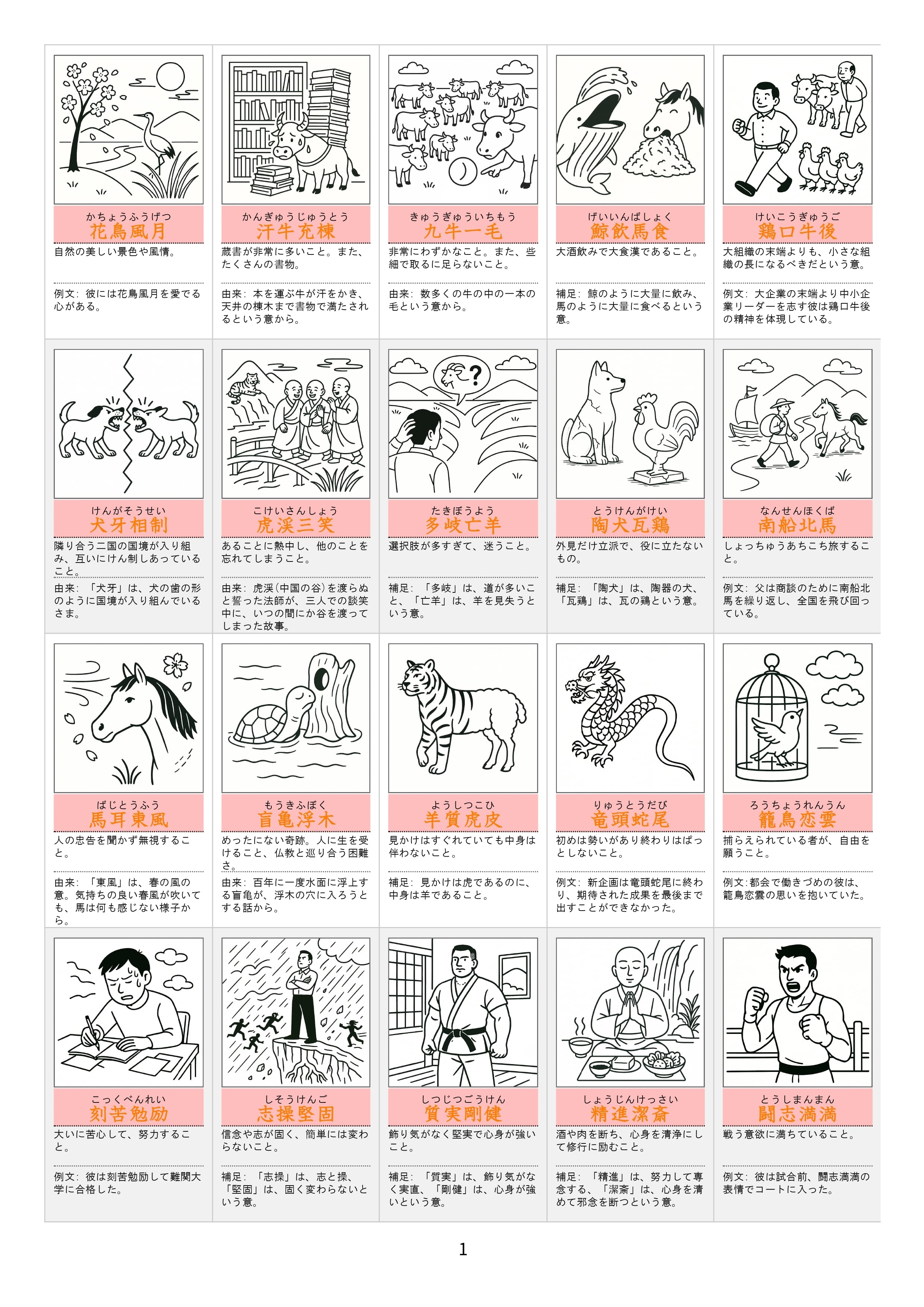 漢検準2級の四字熟語イラスト問題集。全260語